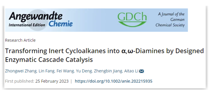 2023年2月25日,《德国应用化学》(Angewandte Chemie International Edition)在线报道了赢咖3、省部共建生物催化与酶工程国家重点实验室李爱涛教授团队最新研究成果。该论文题目为“Transforming Inert Cycloalkanes into α,ω-Diamines by Designed Enzymatic Cascade Catalysis”。团队成员博士研究生张中伟和硕士研究生方淋为本文的共同第一作者,李爱涛教授为通讯作者(图1)。